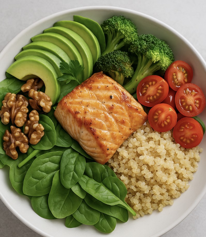 점심 : 연어 샐러드 (케일, 시금치, 아보카도, 아몬드, 올리브유 드레싱), 통곡물 빵